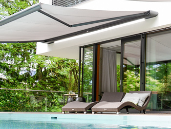Awnings have long been tried and tested with their long-term durability, as well as their functional sun protection for sunny days and especially for hot days - a decorative fabric sun protection system is almost indispensable today, when one would like to relax for some hours on one´s own patio or terrace. Fabric awnings for providing shade require particularly sensitive motors when compared to other applications. elero has particularly specialised in manufacturing these specialised motors. With the RevoLine “Sun” motor generation special attention has been given to meet the needs of fabric materials. The Sun motor tensions the awning fabric very gently and with great care. An adaptive force curve provides the fabric with exactly the right amount of tension necessary. This preserves the awning system so that it can provide many years of trouble free use. Due to its low lateral space requirements the motors can be easily integrated into standard sun protection devices. Both installation and commissioning are carried out easily and quickly.