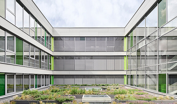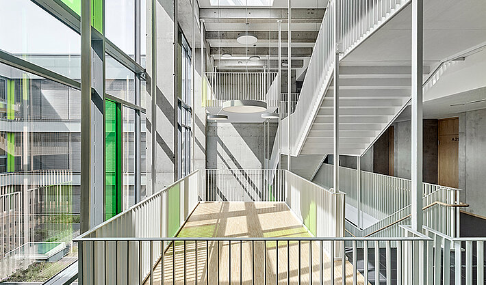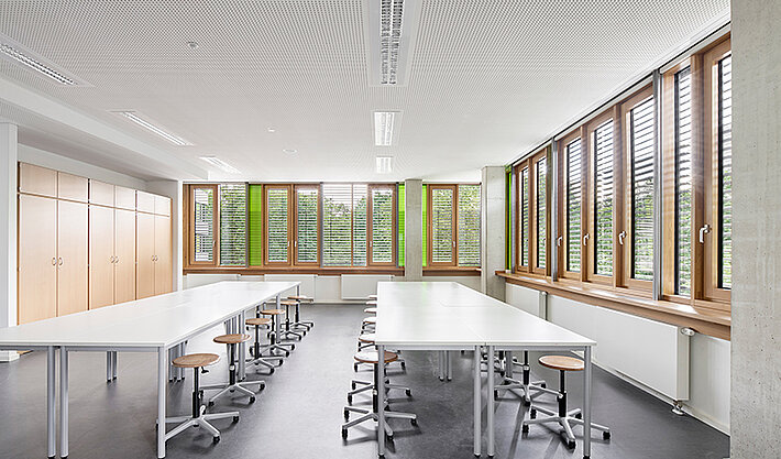With generous glazing, many views into and across the surrounding greenery, a sustainable energy concept and a modern glass-fibre concrete façade, the Carl-von-Ossietzky Comprehensive School in Cologne-Longerich, which was completed in 2020, enables about 1,000 pupils and teaching staff to learn and teach in a green environment. 415 external venetian blinds motorised with JA Comfort SMI drives from elero provide optimum lighting conditions and summer heat protection.