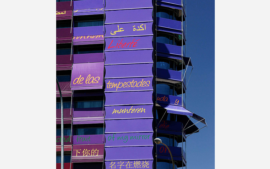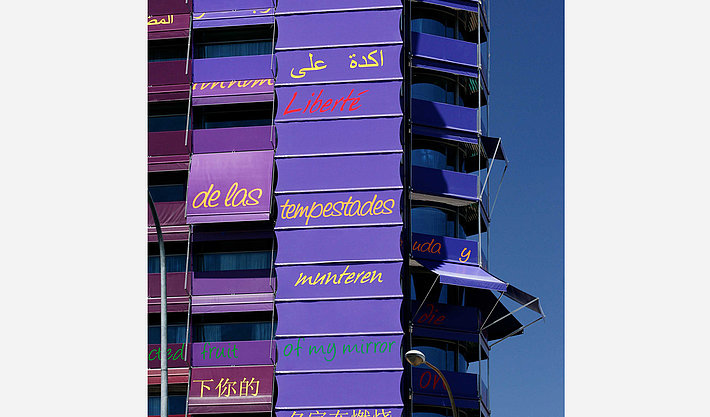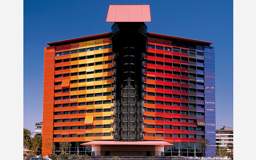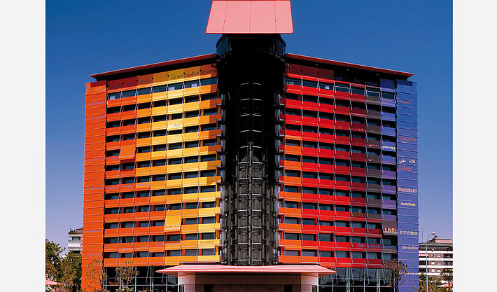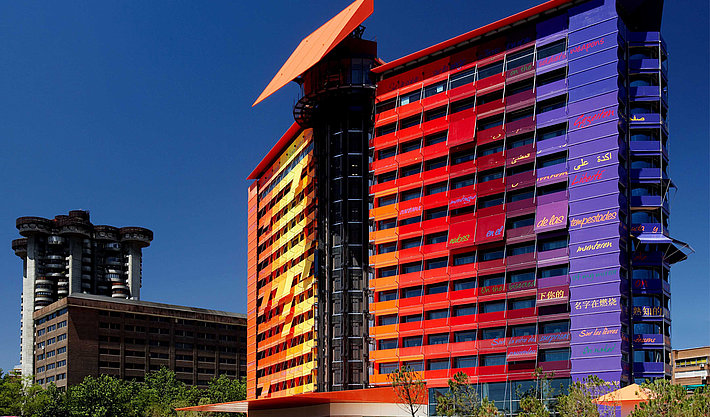 500 awnings in 14 different colors envelop the façade of the 5-star hotel “Puerta America” in Madrid, designed by star architect Jean Nouvel. Thanks to the incident light through the colored material of the awnings, each of the individually-appointed rooms is lent a special color – and a unique atmosphere. The technical implementation of the striking sun protection system was assumed by the Italian company Model System Italia. When seen from the street the awnings, fitted with elero drives, are also an eye-catcher: Extracts from the poem “Liberté” by Paul Eluard attract the attention of passers-by.