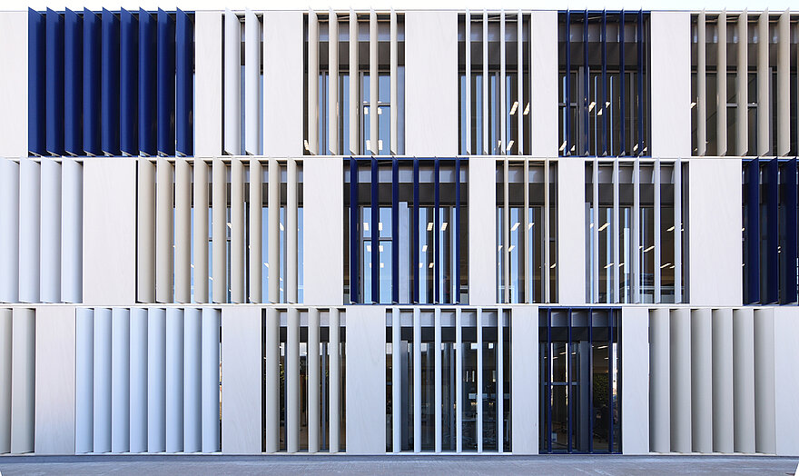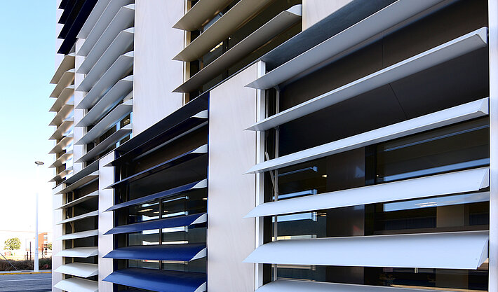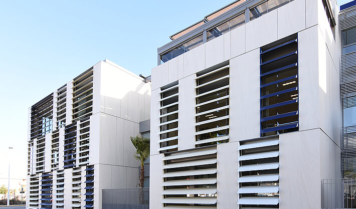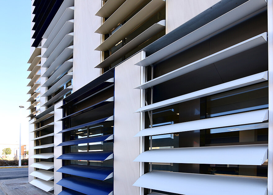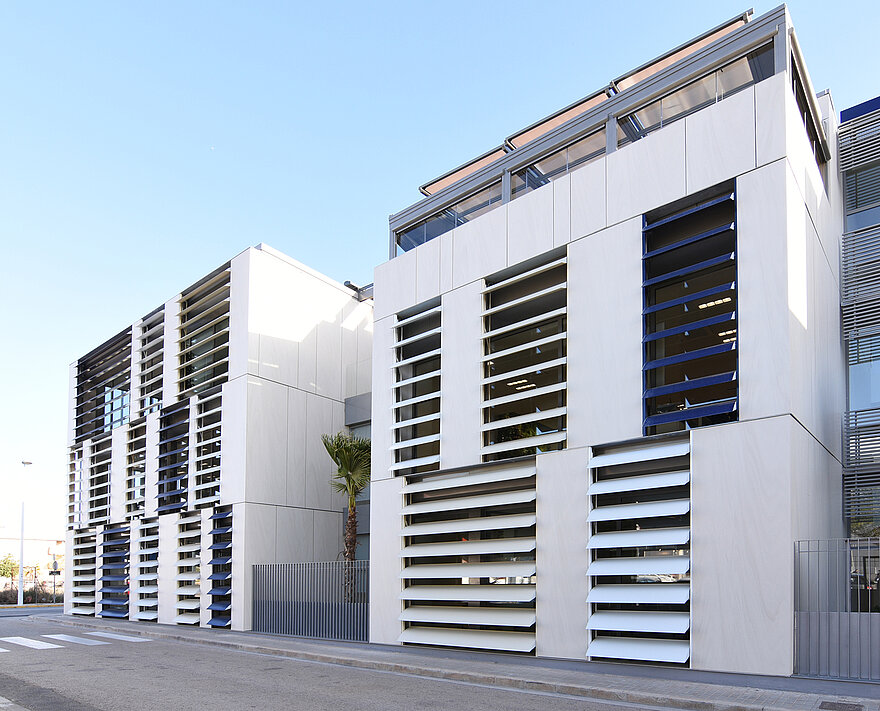 The project was planned by the architecture firm Sanahuja & Partners and was heavily influenced by the “biophilic design” school of thought. This architectural approach endeavours to incorporate nature into building spaces and interiors to a greater extent. External sun protection systems are an example of how intelligent building technologies can be used to attain biophilic design goals: they control the entry of direct sunlight and so reduce the level of direct radiation. Dynamic façades provide shade for the building and can generate electricity in an environmentally-friendly manner. Moreover, the appropriate management of daylight ensures pleasant illumination of the interiors and thus a healthier work climate. The Nice branch office in Spain and elero jointly developed a solution for the best-possible use of sunlight with Umbelco, a provider of sun protection blinds with more than twenty years industry experience.