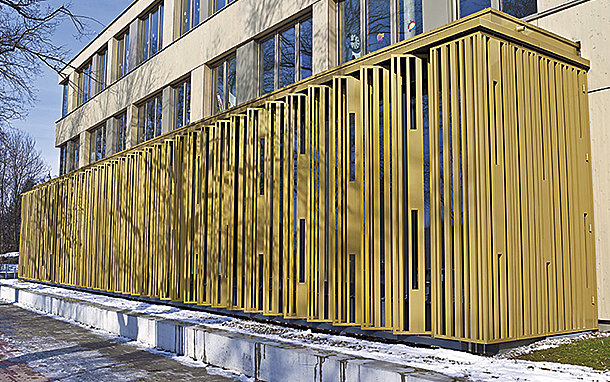 Reliable visual protection with optimum use of natural light was the challenge faced by the Berlin-based architects’ office Heydorn.Eaton when it was commissioned with the extension of Rosenheim Elementary School in 2005. The solution is a movable façade, consists of 38 vertical metal slats, in front of the windows. The slats are moved by the drive system LIMAline 300 from elero.