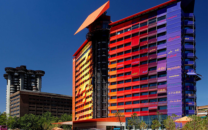 500 awnings, fitted with elero drives, in 14 different colors envelop the façade of the 5-star hotel Puerta America in Madrid, designed by star architect Jean Nouvel.
