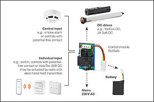 As well as the rechargeable battery and the 12 V drive, it is also possible to connect operating elements such as a central control and switch to ExitSafe. A smoke alarm can likewise be connected – thus ensuring more safety: if the smoke alarm is activated, roller shutters, venetian blinds and screens are raised independently by the mains voltage.