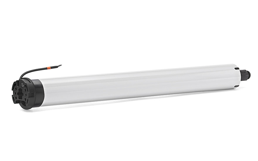 The new super quiet radio tube drive with round head for roller shutters with two selectable running modes: standard running or whispering mode, is suitable for shafts with a diameter of 50 mm or more, has a blind protection and a noiseless soft brake.